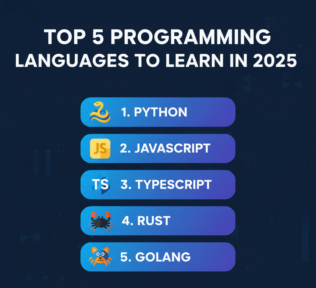 Here are the top five programming languages to learn in 2025 — chosen for their popularity, job demand, and versatility.